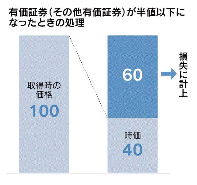 ▽…減損や評価損は企業が保有する株式や工場などの資産の価値が大きく下がったときに、目減り分を決算書に反映する会計ルール。工場が稼働せずキャッシュフロー(現金収支)を生まなくなった場合など、「工場の価値が下がった」とみなし、その分を損失計上することがある。会社が持つ資産の価値は決算書の貸借対照表に記されており、減損や評価損を計上すると貸借対照表の資産の額も変わる。
