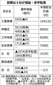 住友商事は北米のパイプライン向け鋼管事業やボリビア鉱山事業での損失計上が響き前期は47%減益となった。海外の主要鉱山は操業停止中で、現在の状況が続けば、年間で最終利益を700億円程度押し下げる。キャッシュフロー悪化を警戒し、今期配当は前期から10円減らす。丸紅は資源案件の減損などで前期は大幅赤字となった。今期は約6割の減配と自社株買いの見送りを決めた。