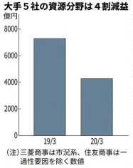 商社各社はデジタル関連や医療、環境などを将来の収益源と見定め、新規投資を進めているが、足元の収益基盤は資源や鉄鋼、自動車など重厚長大ビジネスに依存する。20年3月期は大手5社の資源部門の最終利益は合計で4000億円超と前の期に比べ4割減った。